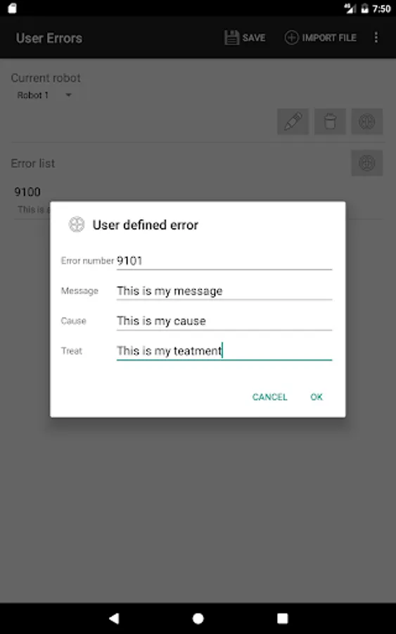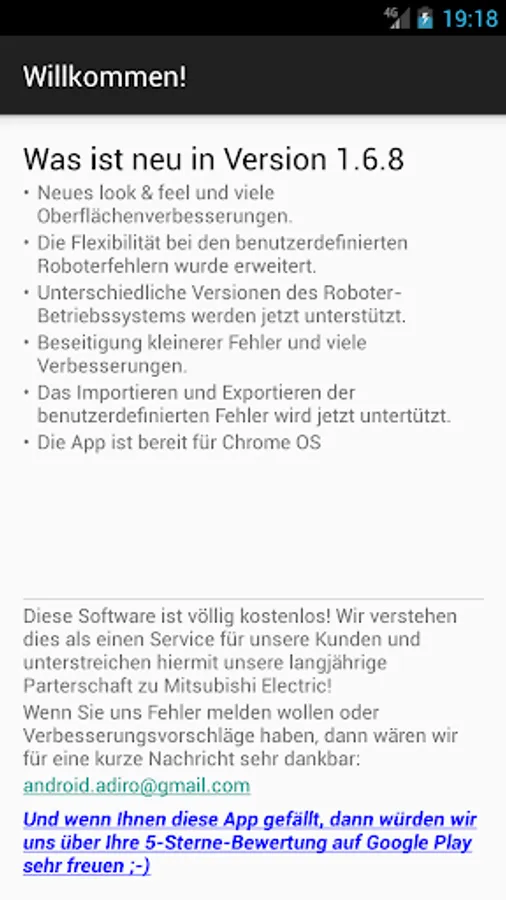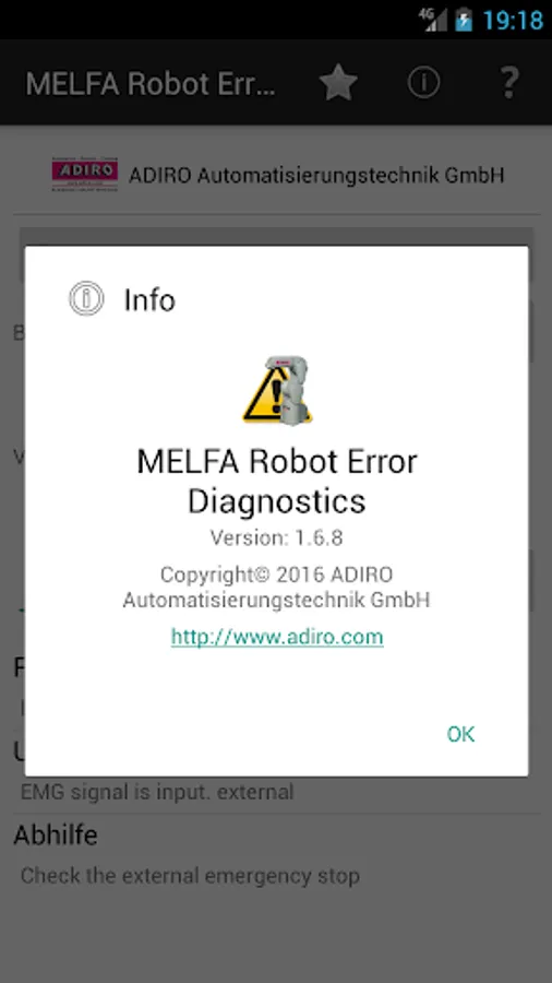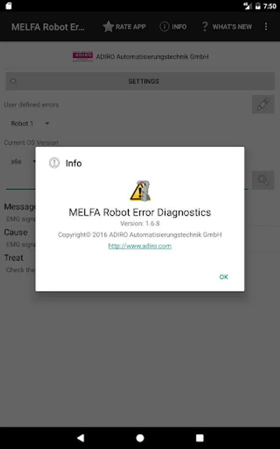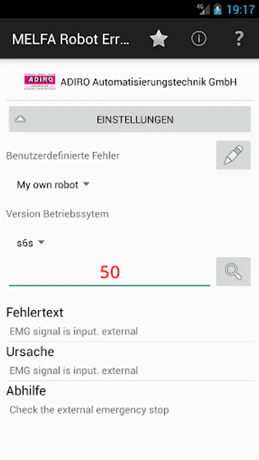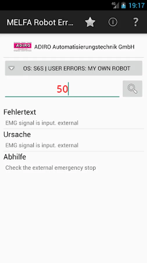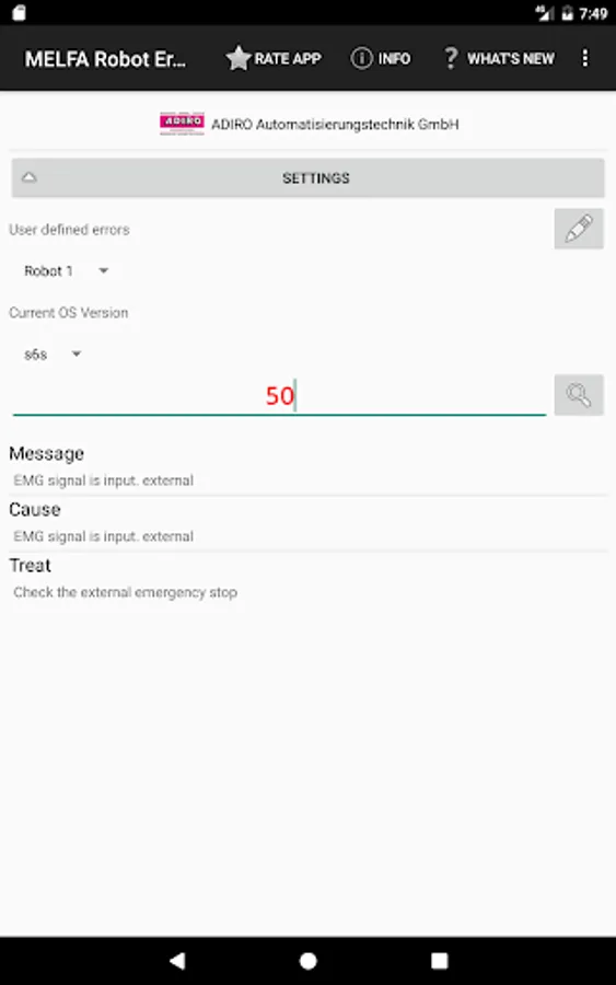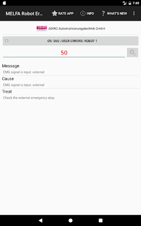 The app gives you the possibility to get detailed error information for Mitsubishi MELFA industrial robots. After you have input the error code you will get the same detailed error information as shown on the teach pendant conntected to the robot. No online connection and no connection to the robot controller is required. The information is provided by a data base delivered with this app.