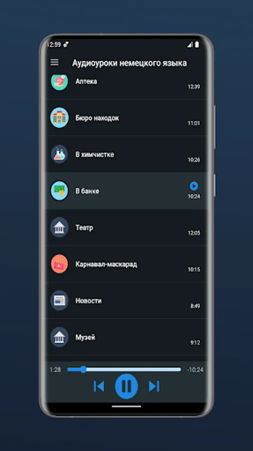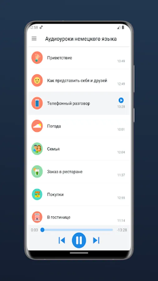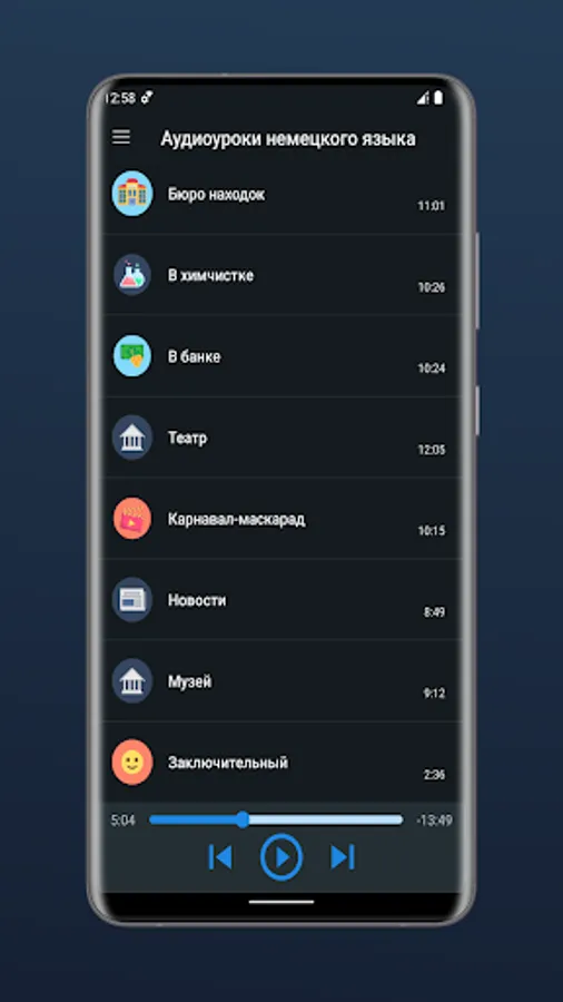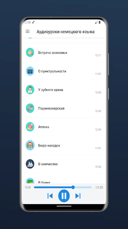 German audio lessons for the intermediate level (from A2-B1) on basic lexical topics such as "Greetings and farewells", "Dialogue in a restaurant" and others. All phrases are pronounced in German and Russian. Perfect for those who want to improve their understanding of German speech and pronunciation, as well as enrich your vocabulary.