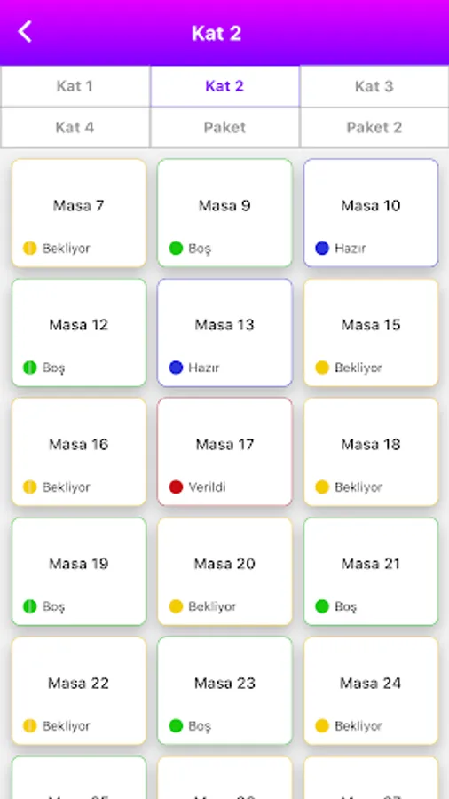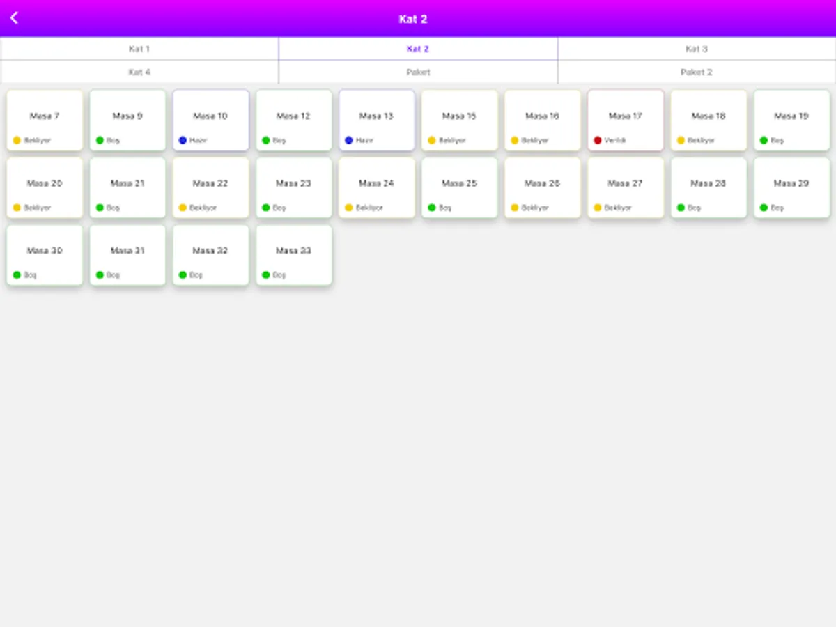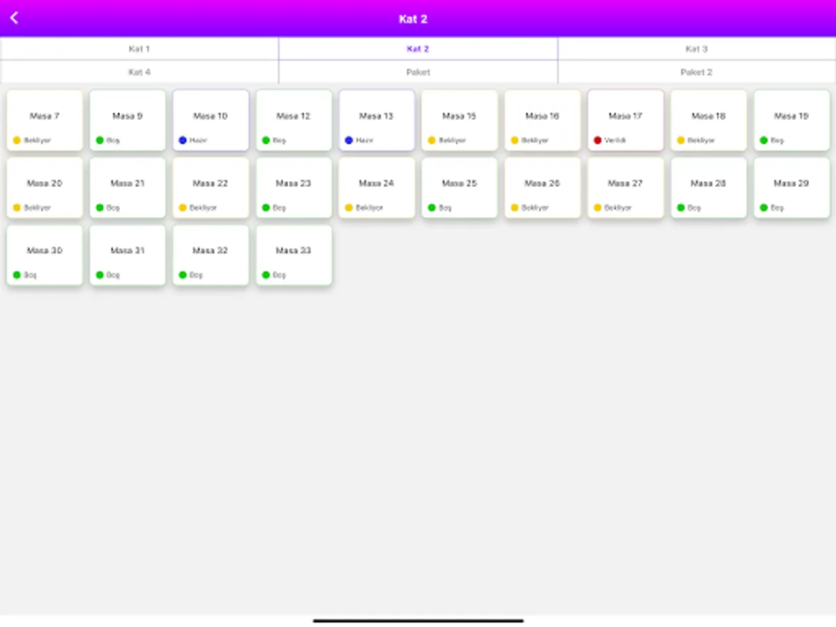 Tables are displayed in 4 different ways: Table empty, order placed, order prepared, order awaiting. You can easily follow the tables with Tiba POS program.