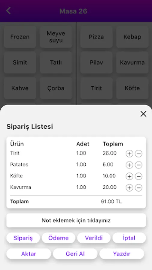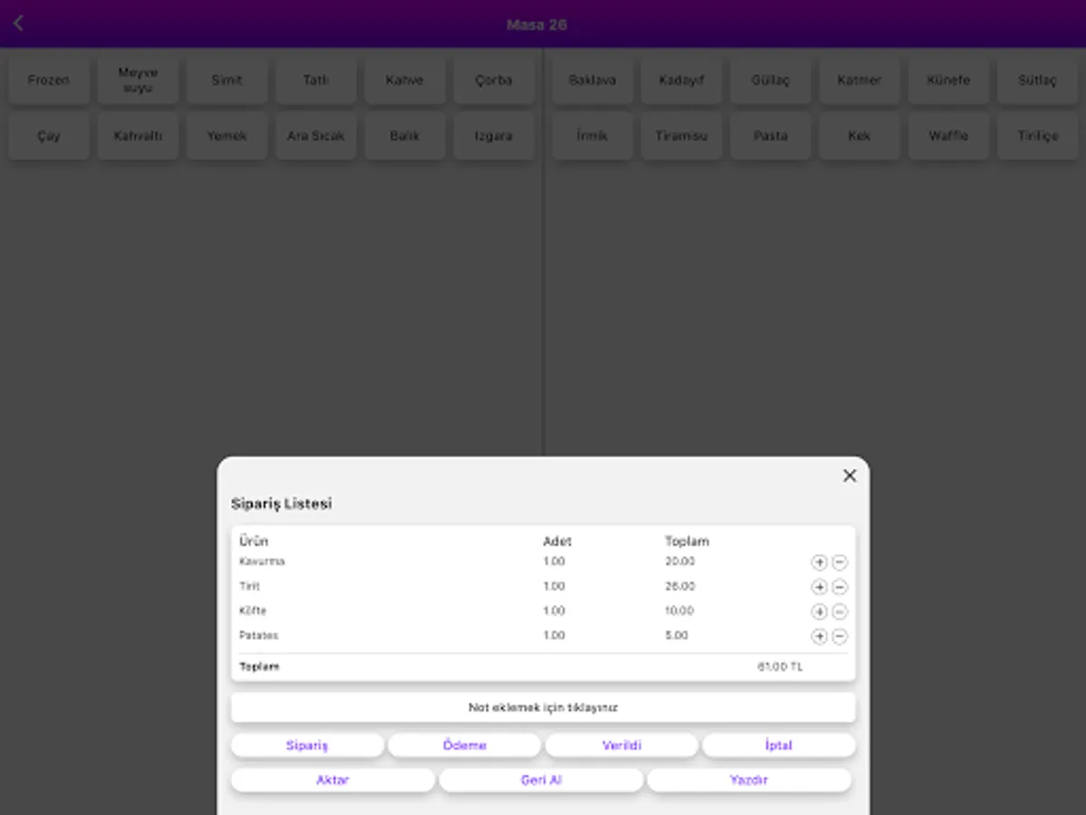 - Ability to enter sub-products into products (For example, you can enter the ingredients of the pizza under the pizza product. In this way, you can send a notification to the kitchen or print it out according to the desired ingredient without the waiter having to go to the kitchen.)