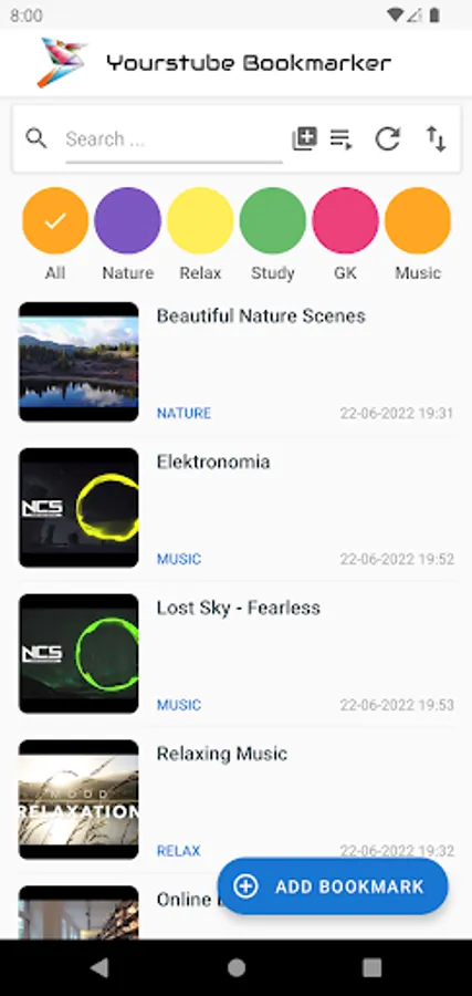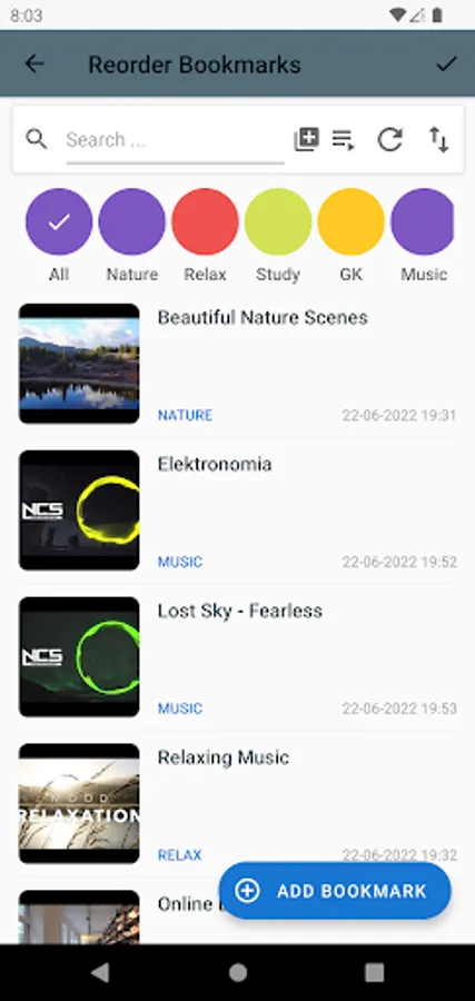 Search : To search for a bookmark, tap on the search bar and type the name of bookmark. The bookmarks will be filtered on the basis of text typed on search bar.