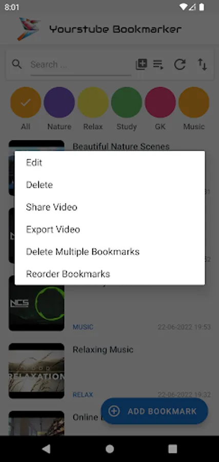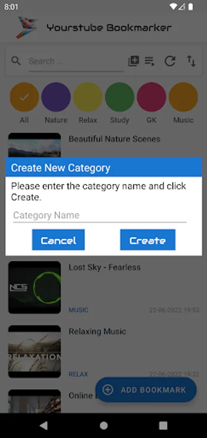 Add a bookmark : To add a bookmark , click on the Add Bookmark button. Then select the category in which you want to save the bookmark. Then, enter the video URL. Finally, enter the name of the bookmark and click on Save button.