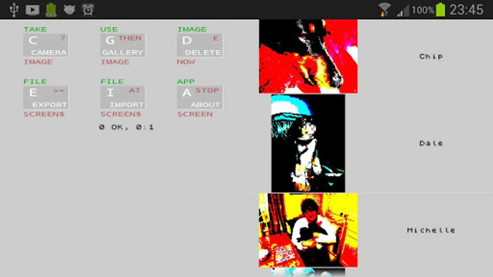 Use pictures from the gallery or capture a "Spectrumized" image in real time (with live preview). Browse previously converted images or export or import .scr (SCREEN$) or .TAP files for use in an emulator.
