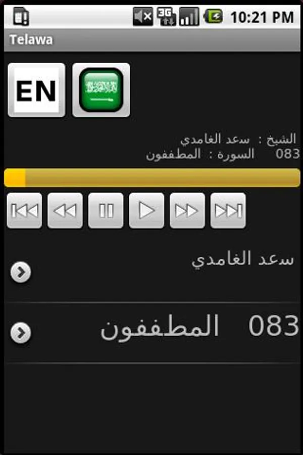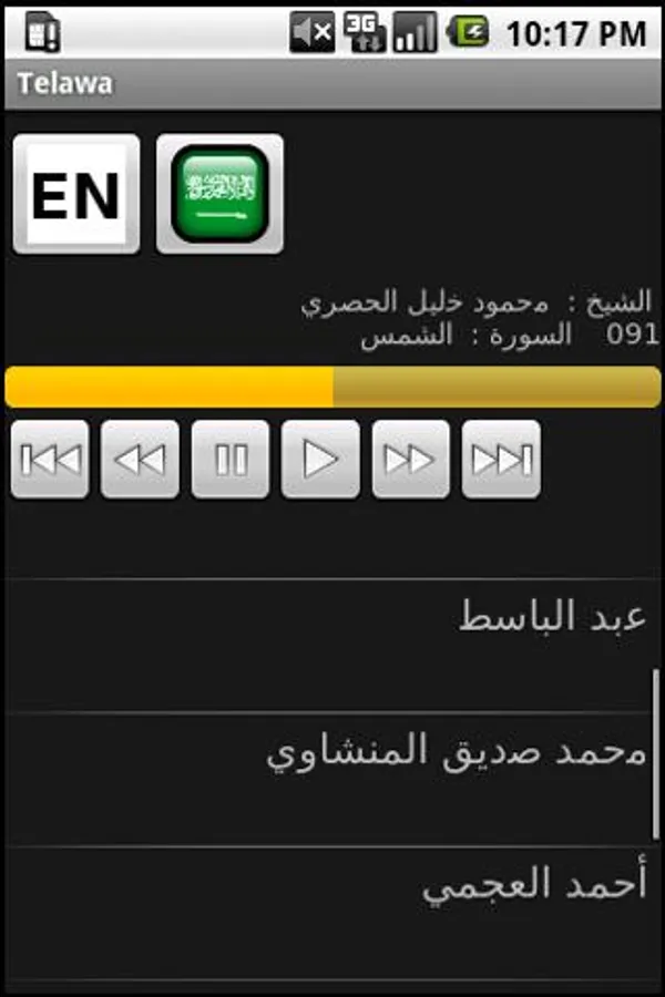 Seven reciters are available: Sheikh El Ghamidi, Sheikh Mahmoud Hossari, al-Sheikh Abd el Bassat Abd el Samad...