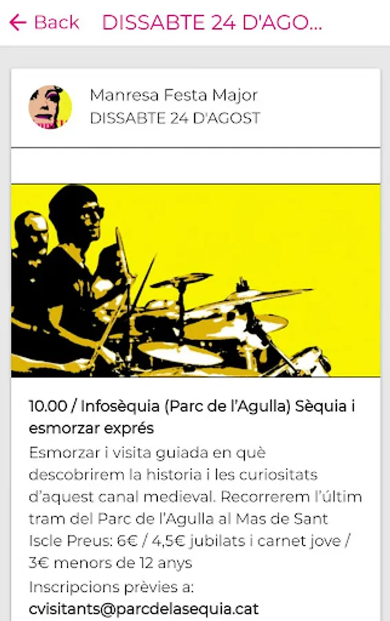 The Festa Major of Manresa is celebrated at the voltant of the later dilluns by darrer dissabte d'agost and this is the great esdeveniment festiu de la ciutat, together with the traditional Fira de l’Aixada.