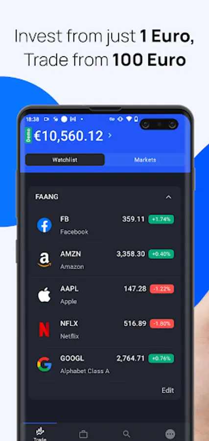 8000 stocks and plus 500+ unique trading options: Forex global, ETF; CFD on Gold, Oil, Futures, Indices and more