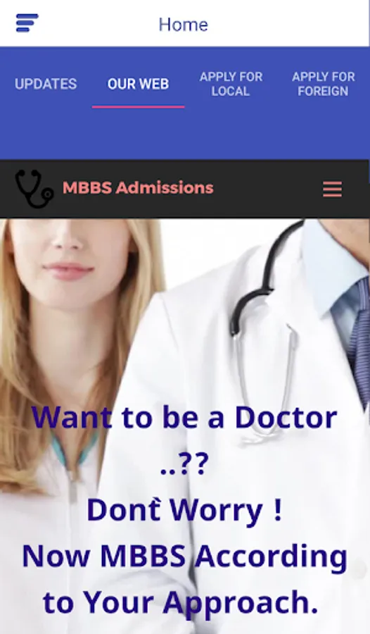 We help the medical students to get admission in MBBS in various countries including Pakistan,Kazakhstan,Kyrgyzstan,Russia,China etc.We promise the students for our best services and quality Education in all Universities.All Universities are WHO recognized.We already served many students.There are number of students who are studying in various Universities recommended by us.They are enjoying excellent level of study.Feel Free to apply online for your bright future in Medical studies through this App.