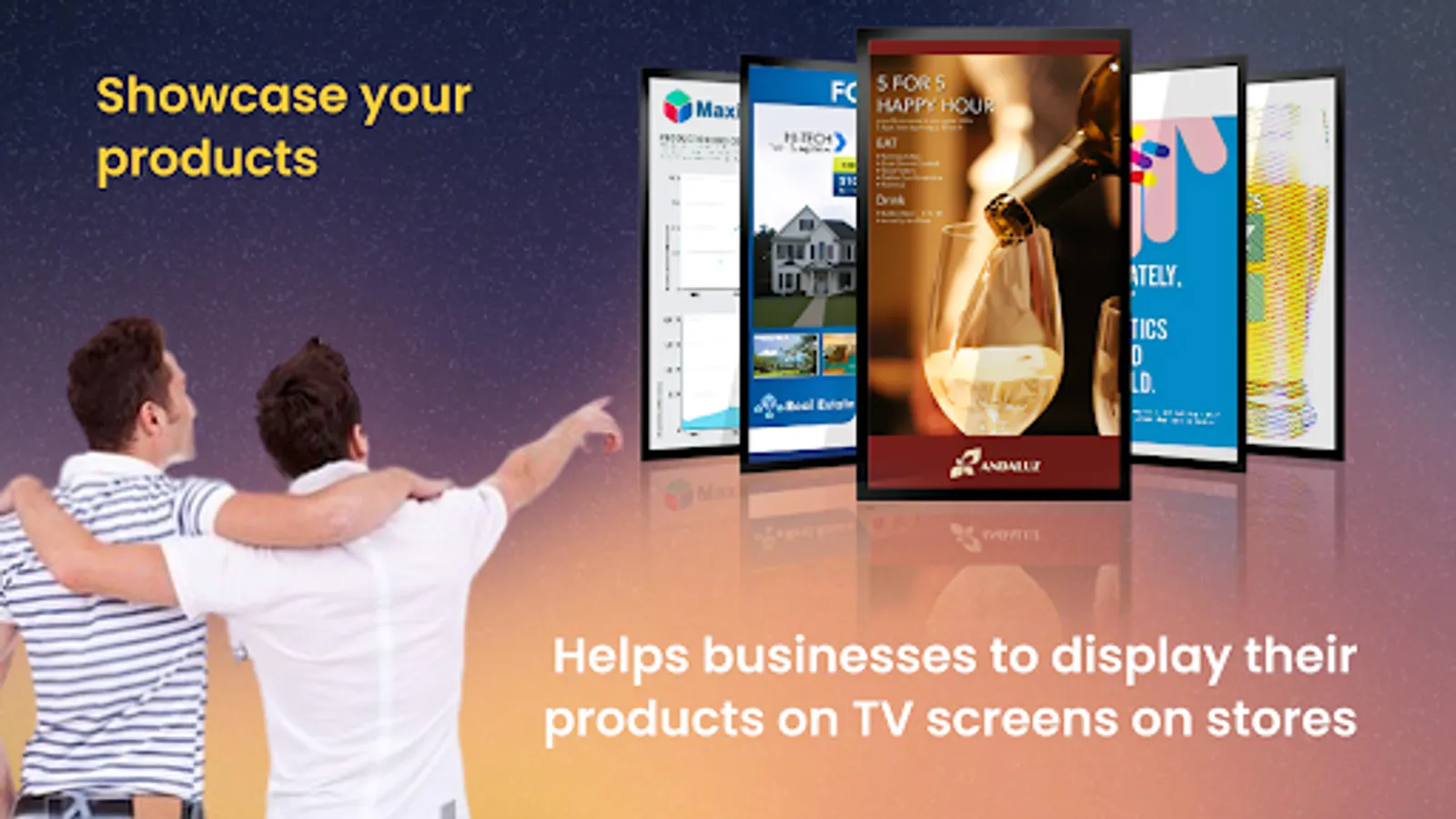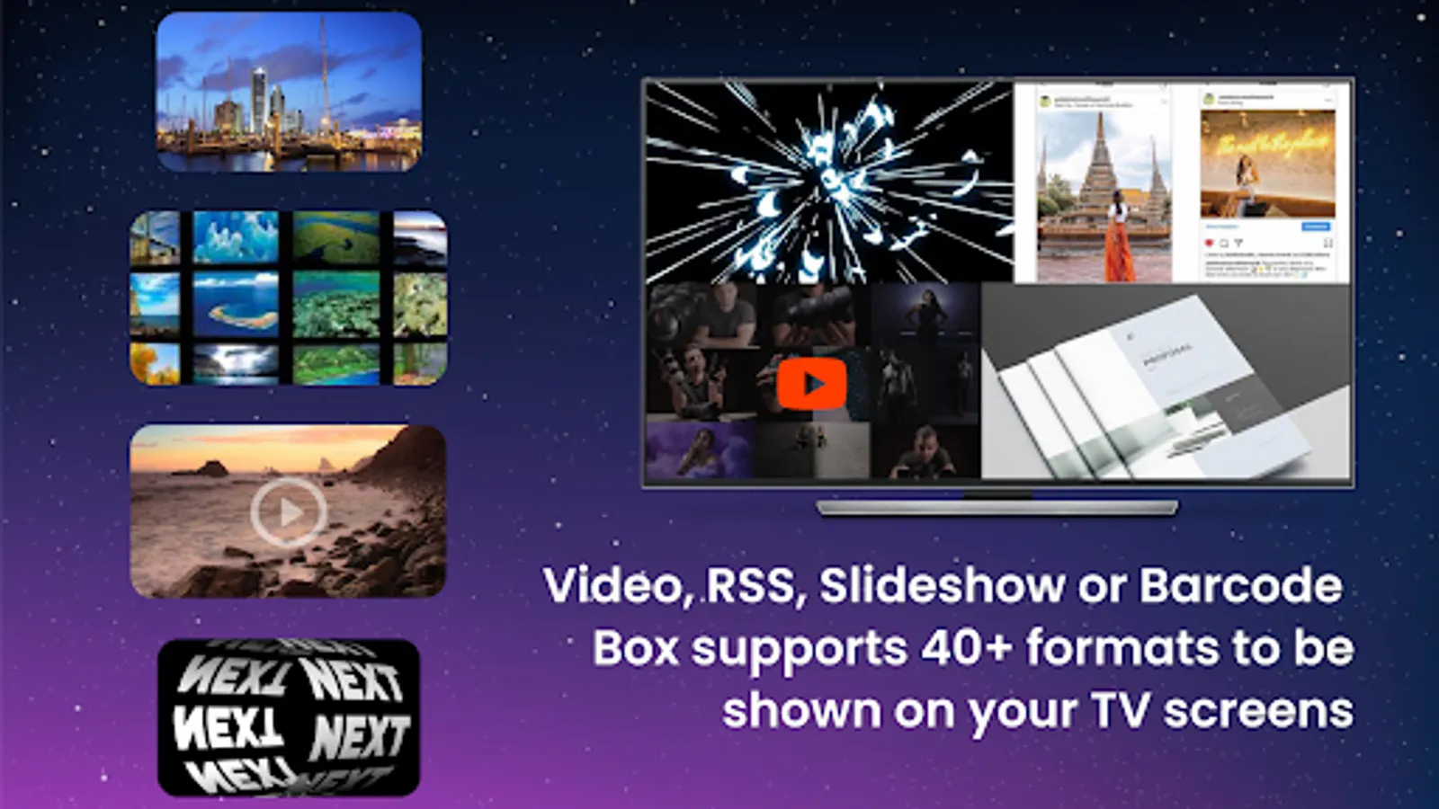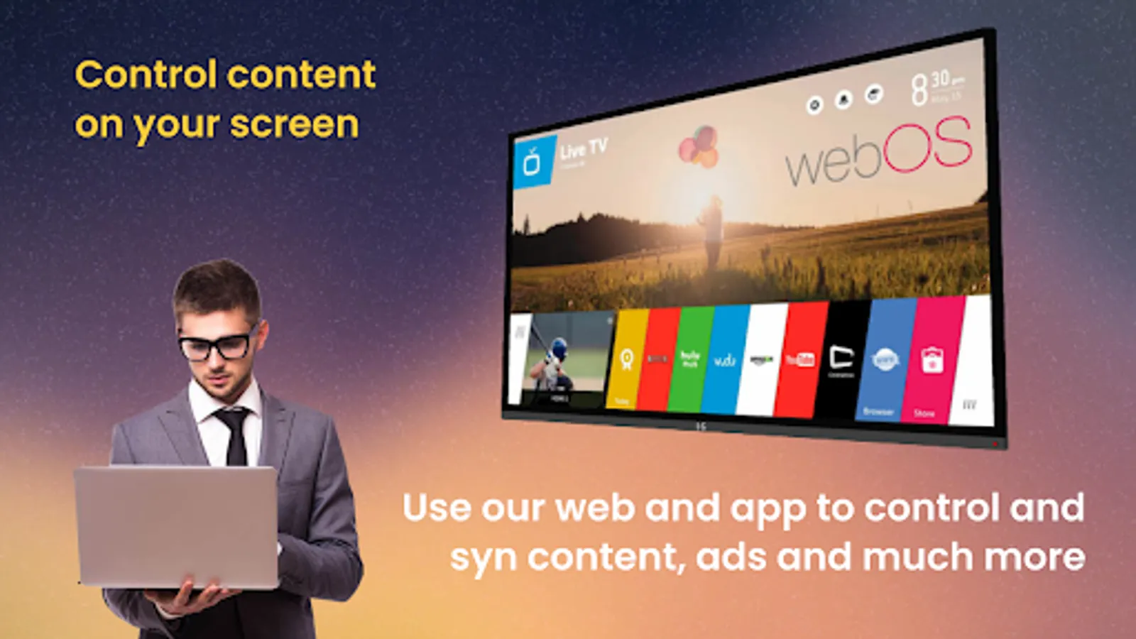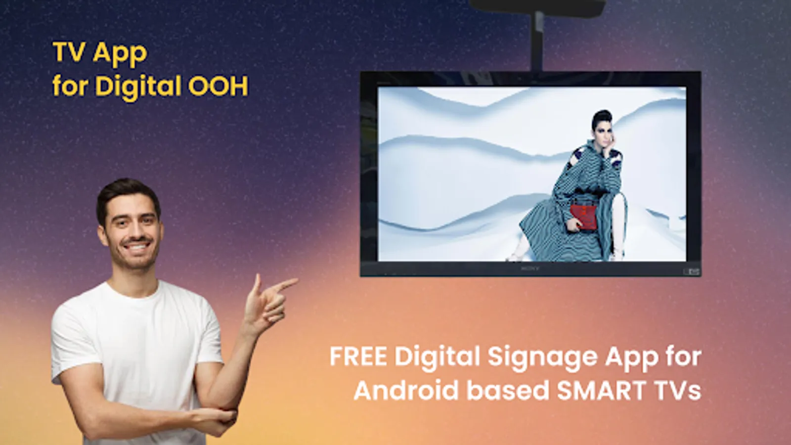The player app enables any Android based screen to play your broadcast. From your home, office or anywhere on the road you can set a broadcast of images, videos and other slides to the Android TV device.