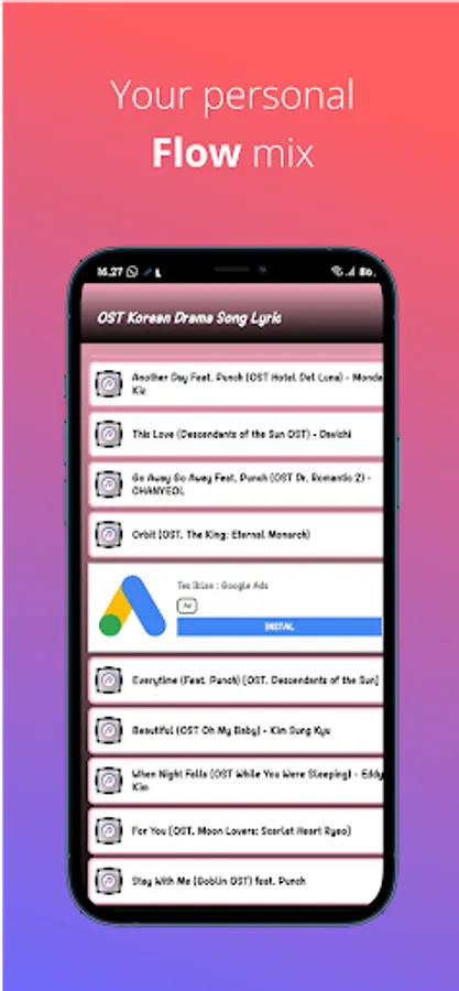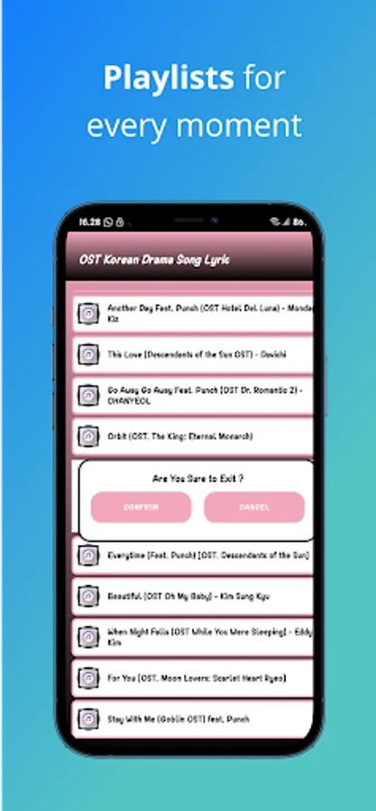 Kdrama OST song's application comes with lyrics in each song and this application can run OFFLINE (without the need for internet), is displayed interactively with clear images that make it easier for users, presented for FREE and can be saved in EXTERNAL MEMORY.