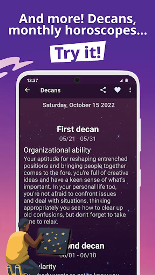 Want to know more ? We even give you access to the ultimate precision tool about your zodiac sign : a detailed view of your decan.