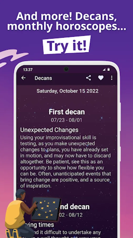 Want to know more ? We even give you access to the ultimate precision tool about your zodiac sign : a detailed view of your decan.