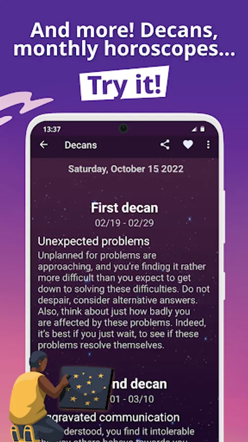Want to know more ? We even give you access to the ultimate precision tool about your zodiac sign : a detailed view of your decan.