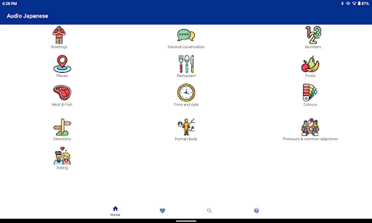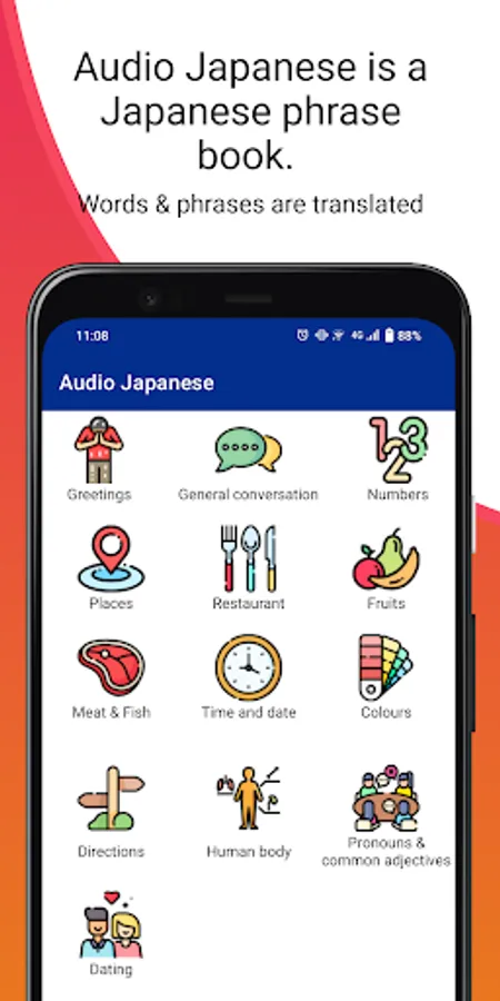Audio Japanese is a japanese phrase book. Words and essential phrases are translated.