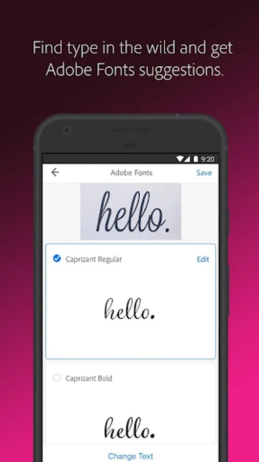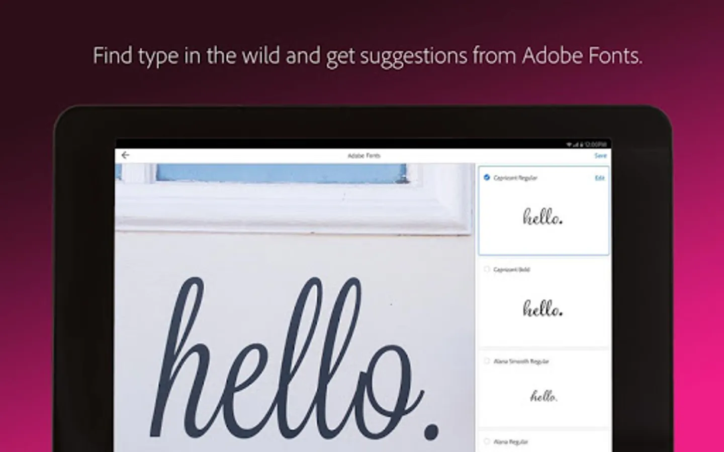 Looking for font finder? Find your perfect font using Adobe Capture. Take a photo of the type you like (in a magazine, on a label, a sign, anywhere!) and watch a list of similar Adobe Fonts magically appear.