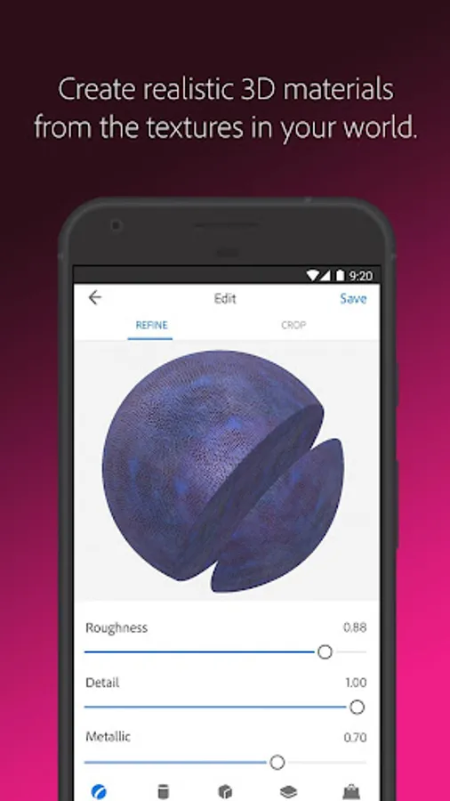 Generate realistic PBR materials for use in 3D design straight from the camera. Modify your materials for even more texture or blend the edges for seamless repeat tiling on your 3D objects.