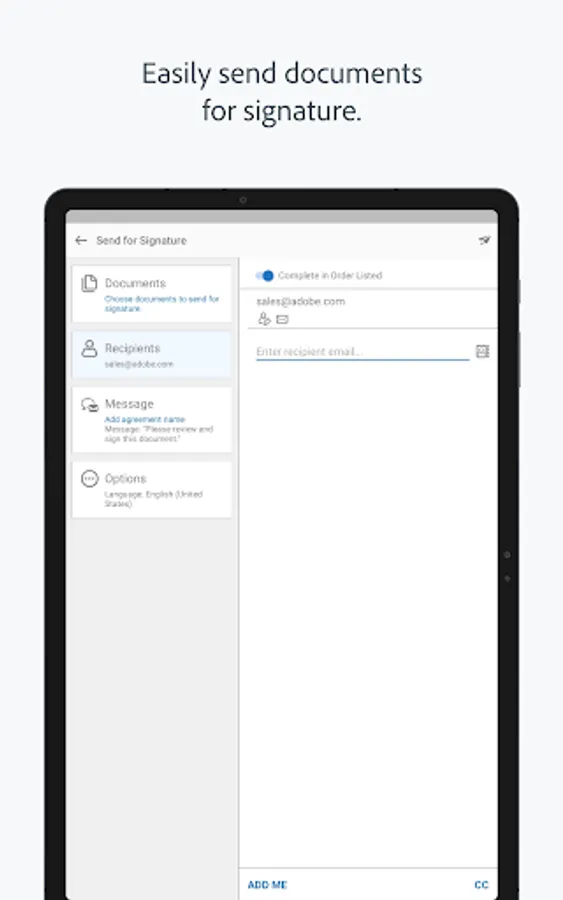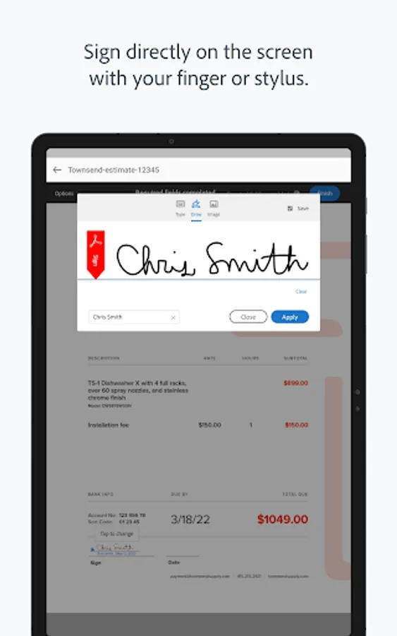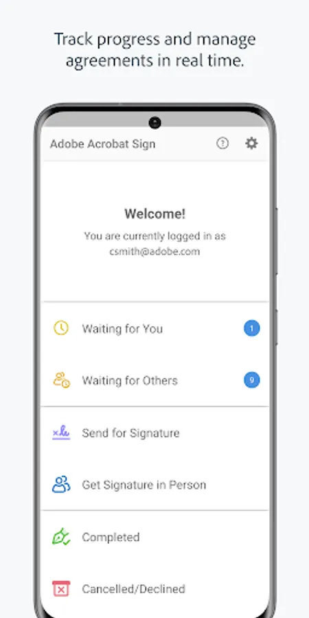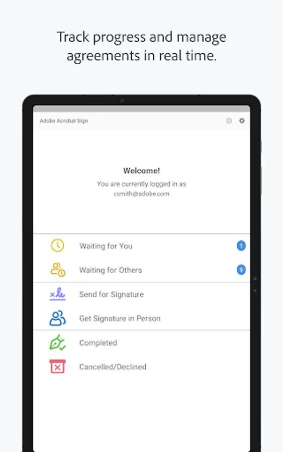 This app is a mobile companion for the Adobe Acrobat Sign e-signature service. With it, you can e-sign documents and forms, send them to others for e-signature, track your documents and get signatures instantly with in-person signing.