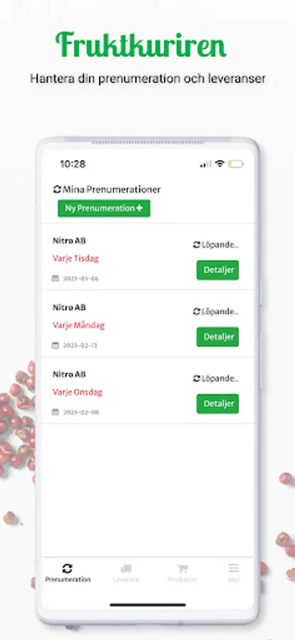 As one of the leading fruit companies in the area, we offer smooth and flexible deliveries of fruit baskets directly to your workplace. With our customer portal, you can easily log in and manage your subscription and deliveries, so that you always get the fruit you want. You can change, cancel and add deliveries easily and smoothly, and we guarantee to always deliver fresh and delicious fruits of the highest quality.