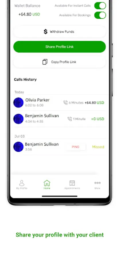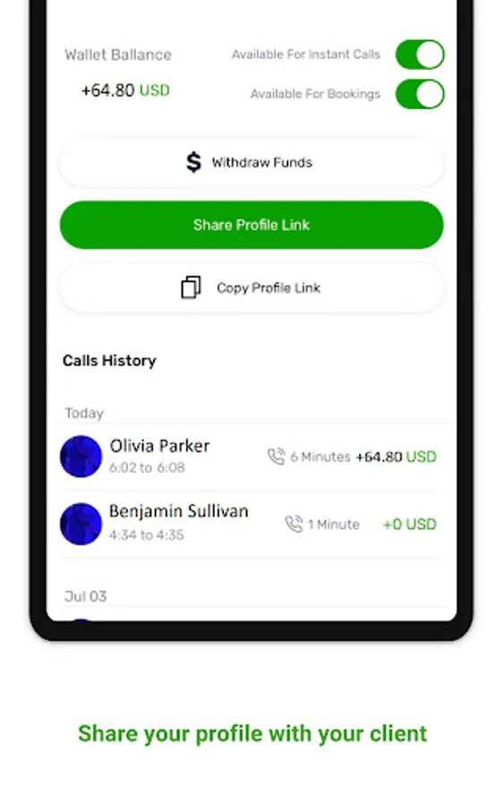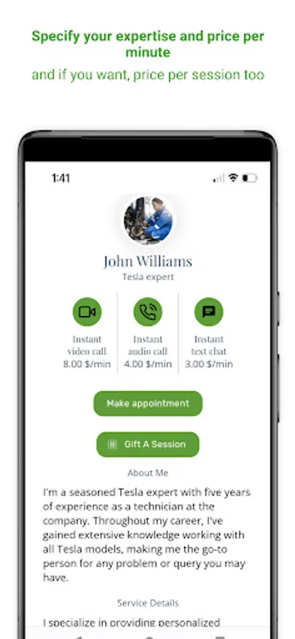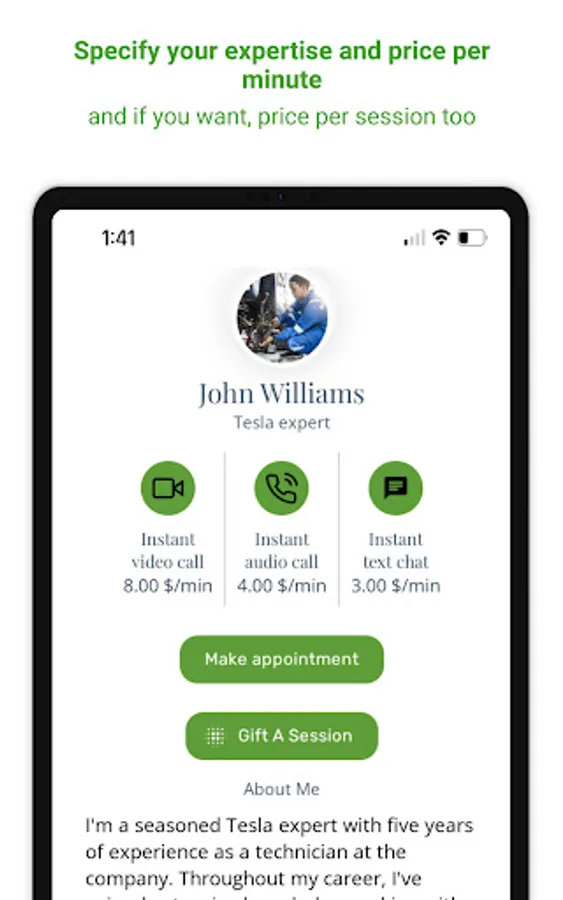 Professionals: Simply set your per-minute fees or flat rates, for voice or video calls and you’re good to go!