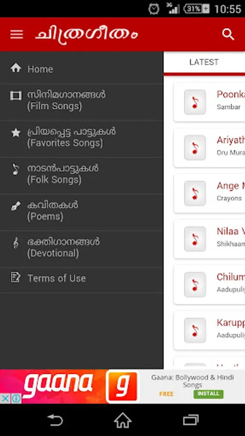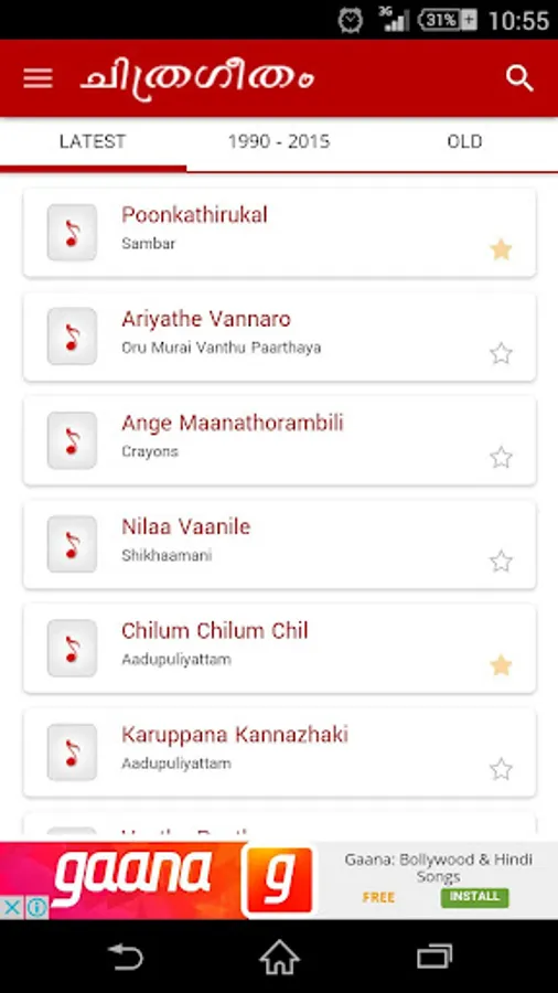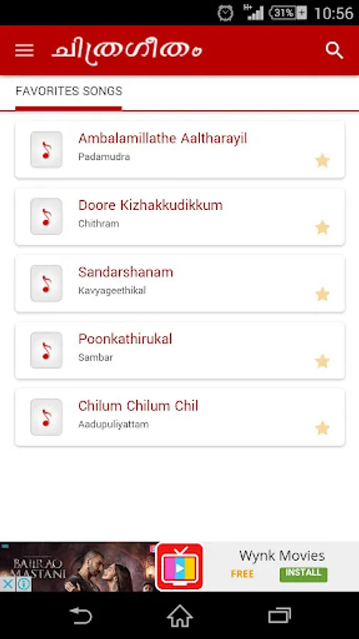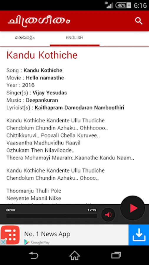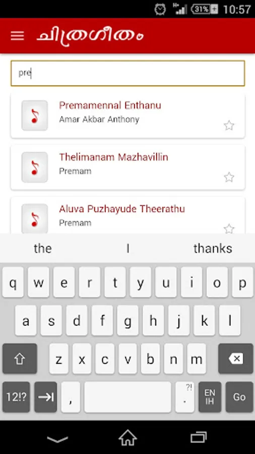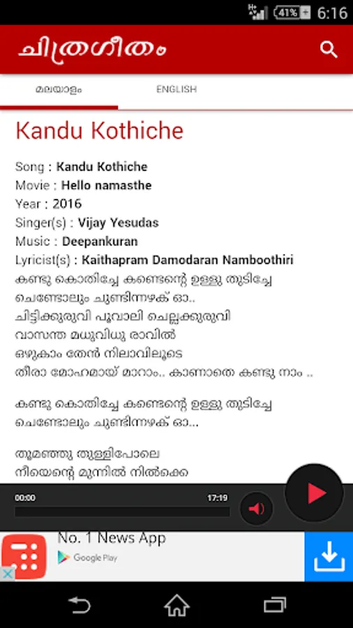 Read all Malayalam movie hit song's lyrics. Get additional information like as Movie Name, Music Director, Lyricist, Singers and Year Of Release. You will get all recent updated songs on top menu / search song from menu to get all songs. The application will initially lyrics just hit songs, that will make less data usage.. so do search song from menu to find your favorite songs. You could browse song by the Song Title, Movie Name and Year. Chithrageetham is an attempt to list all the greatest songs lyrics in an easy to enjoy way, find your old favorite songs with memorable moment.