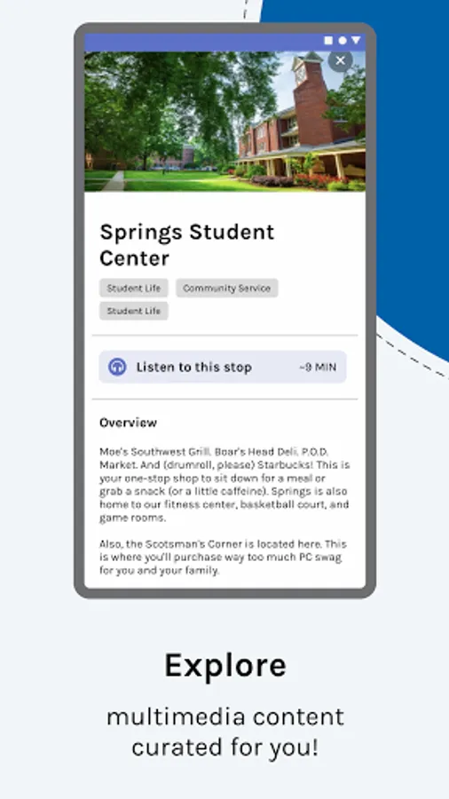 ◦ Listen to or read content about Presbyterian's campus, history, traditions, student life and academics