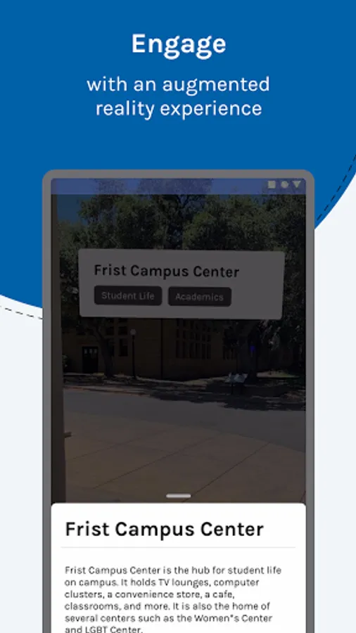 ◦ identify and learn about points of interest around campus using Augmented Reality