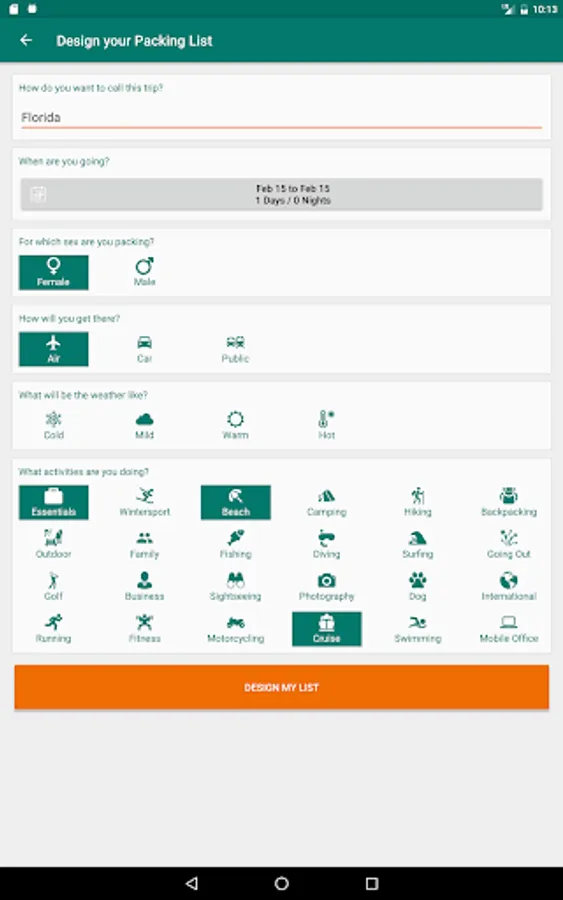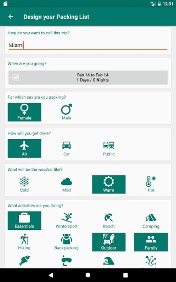+ Configure your trip profile with destination, duration, activities, transport and laundry frequency
