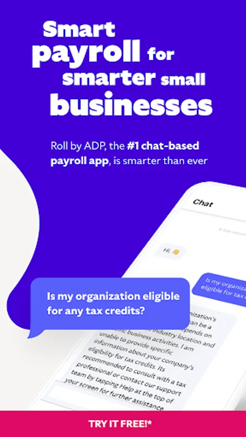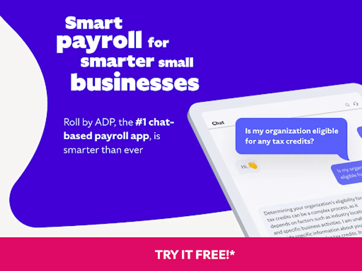 Try Roll FREE for 3 months! 😍 If you know how to chat 💬 , you know how to run payroll with Roll! Plus, Roll brings decades of expertise from ADP, the biggest name in payroll. With Roll, running your small business payroll really is as easy as Download. Chat. Pay.