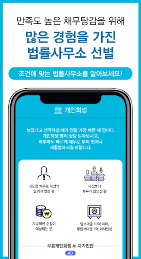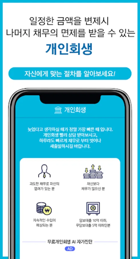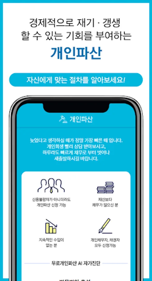 Individual rehabilitation Personal bankruptcy Corporate rehabilitation Corporate bankruptcy Check eligibility conditions and receive debt relief through simple free consultation self-diagnosis without registration procedure.