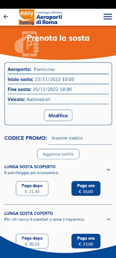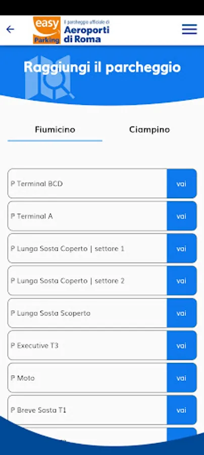 easy Parking è l'app del parcheggio ufficiale di Aeroporti di Roma, che ti permette di prenotare e pagare la tua sosta negli aeroporti di Fiumicino e Ciampino in modo semplice, veloce e sicuro.