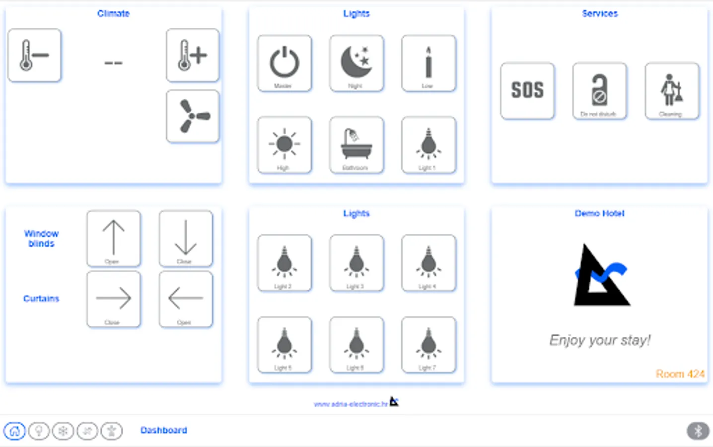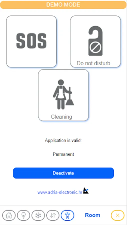 AE Room is an application intended for control and monitoring of Smart Hotel Room System made by Adria electronic. Application displays all relevant information for the given hotel room.