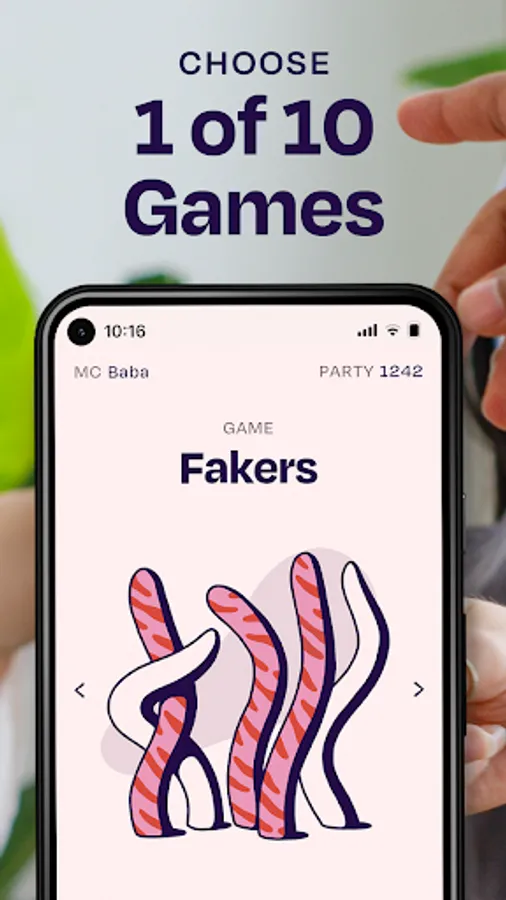 - 10 games: Split, Fakers, Pairs, Leader, Groups, Statues, Possessed, Fakers++, Tree Huggers, and Speaker.