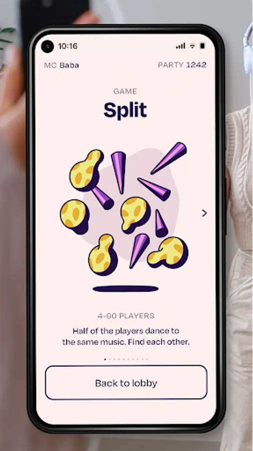 A party game for 4 or more players who are all in the same room wearing headphones. Kind of like silent disco, but with games!