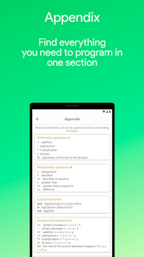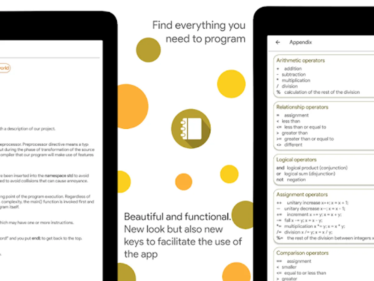 Learn C++ is also supported by Android Tablets with a minimum Android 5.0, it is recommended to use devices with a minimum screen of 4.3 inches, it is recommended to rotate the screen for better reading and understanding of programs.