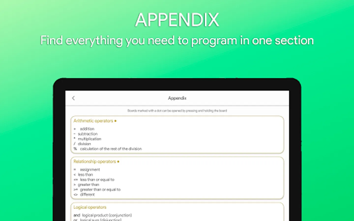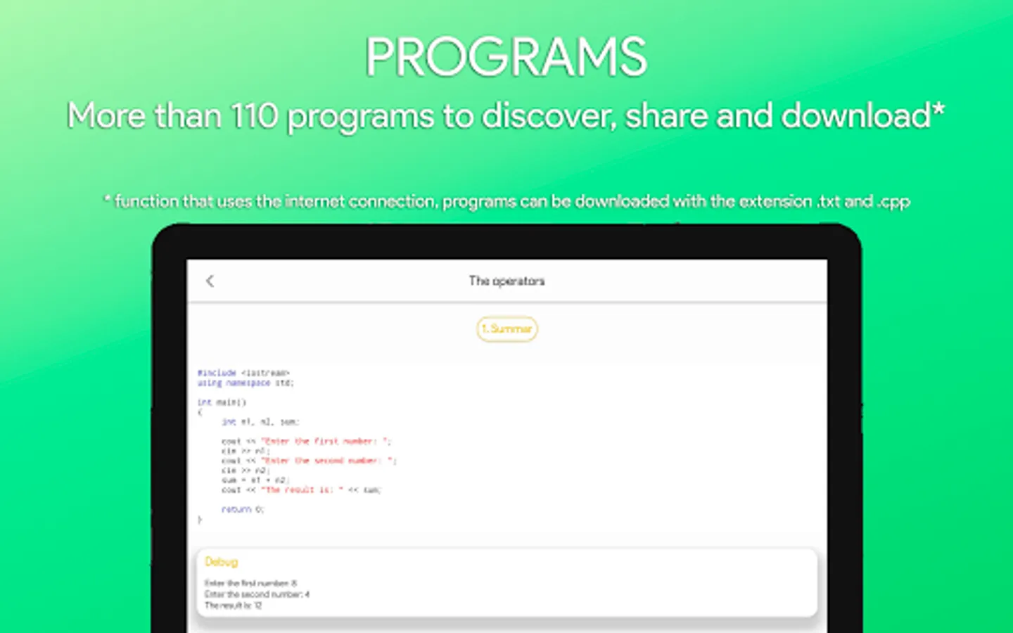 Learning C++ PRO is also supported by Android Tablets with android minimum 5.0, it is recommended to use devices with a minimum screen of 4.3 inches, it is recommended to rotate the screen for better reading and understanding of programs.