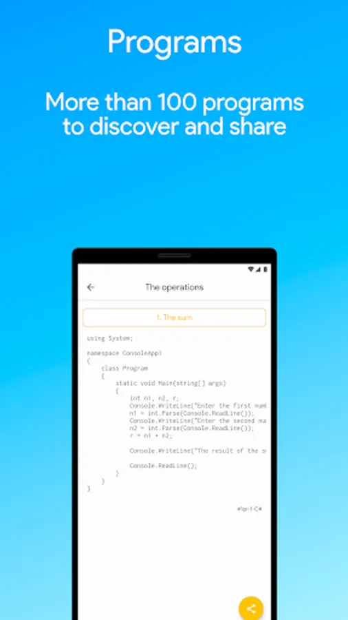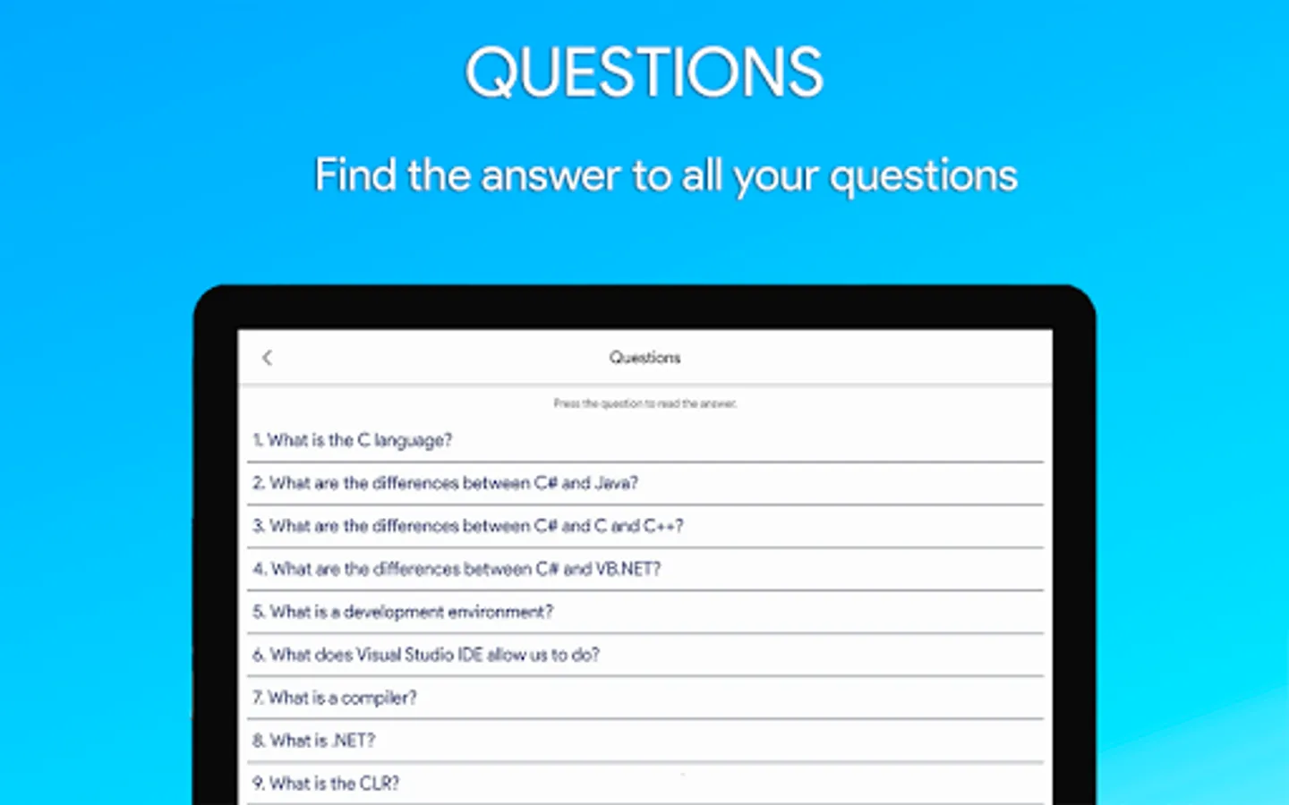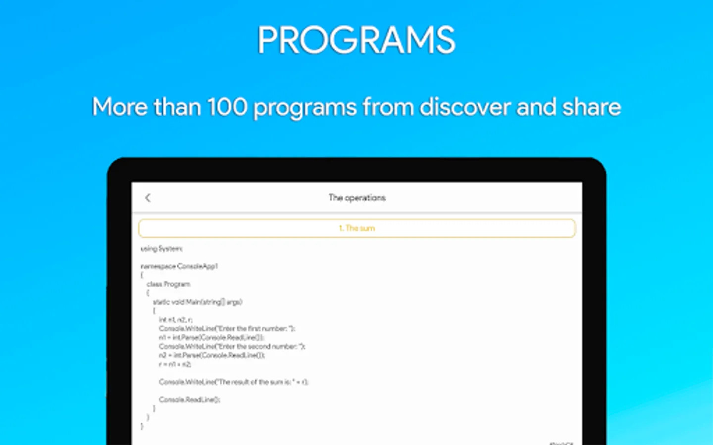 Learning C# is also supported by Android Tablets with android minimum 5.0, it is recommended to use devices with a minimum screen of 4.3 inches, it is recommended to rotate the screen for better reading and understanding of the programs.