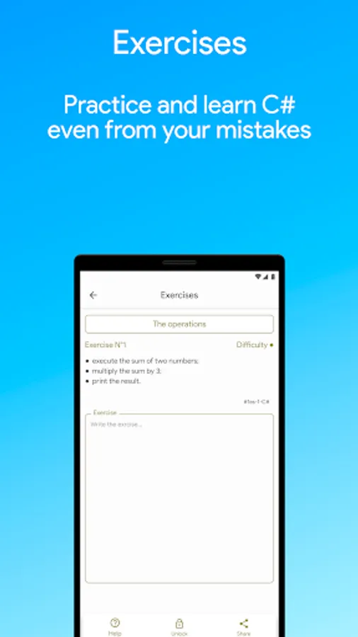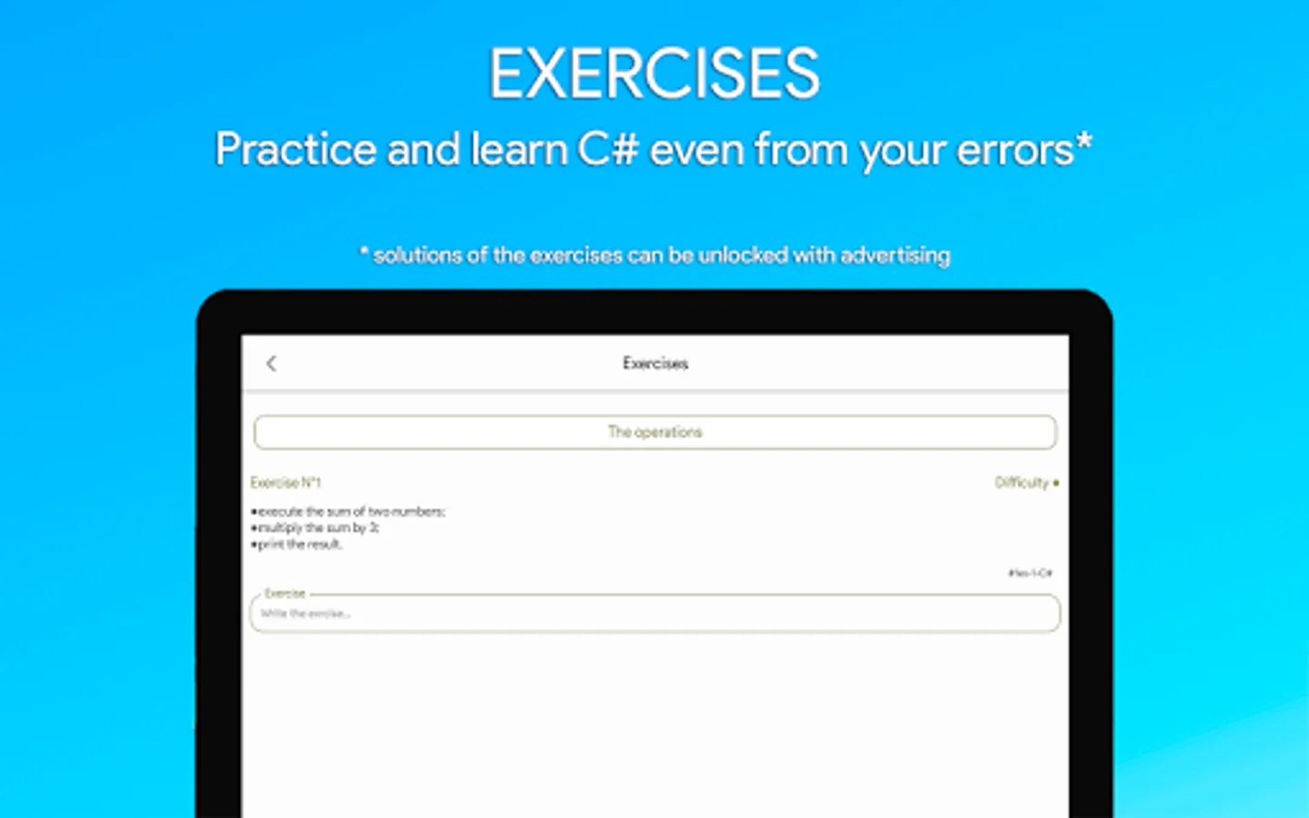 Why are there advertising videos in the application? To unlock the exercise solution you need to see an advertising video that can vary from 10 to 30 seconds of playback. Why these videos? It is too easy to "study" the C# if you have all the solutions of the programs.