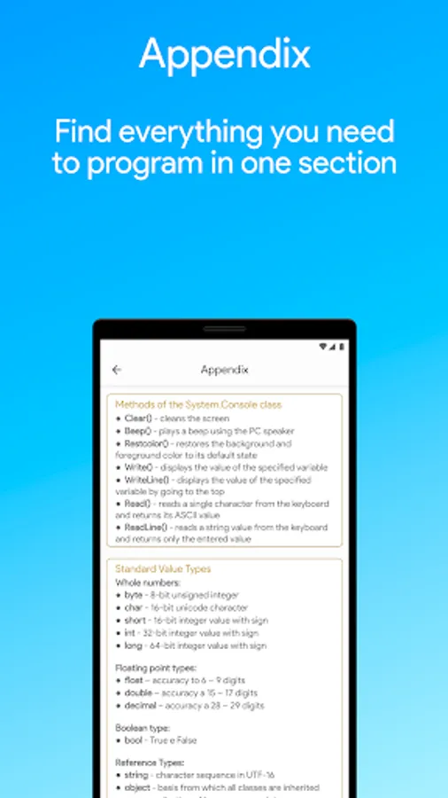 The application has a very simple interface and can be used by everyone. Learning C# is offline and can be used at any time and place. It is especially recommended for those who want to learn C# but also for those who want to deepen or revise it.