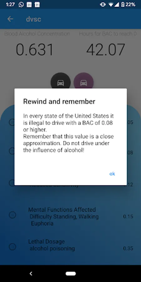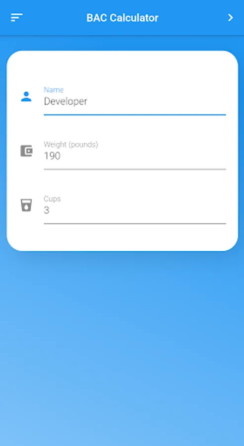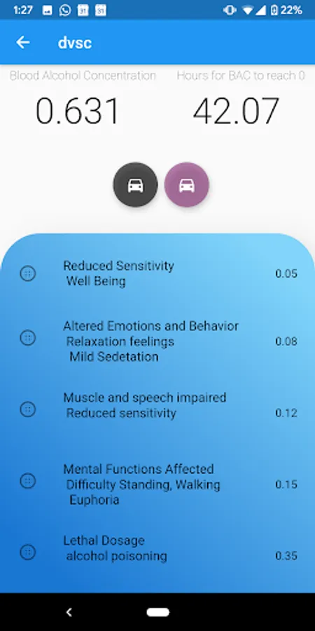 BAC Calculator is an application that shows your blood alcohol concentration, estimated time until sober, impairments, and more. These calculations are estimated according to your weight and the amount of drink you took.
