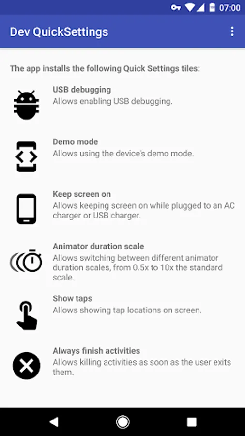 The app provides a few Quick Settings tiles that act as shortcut to Development Options in the Android device: