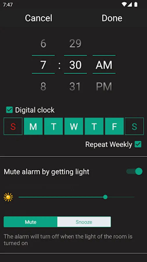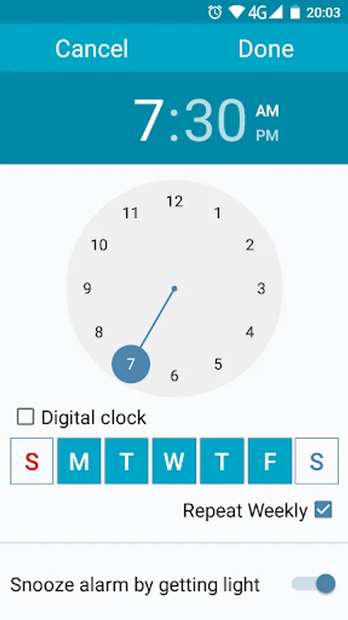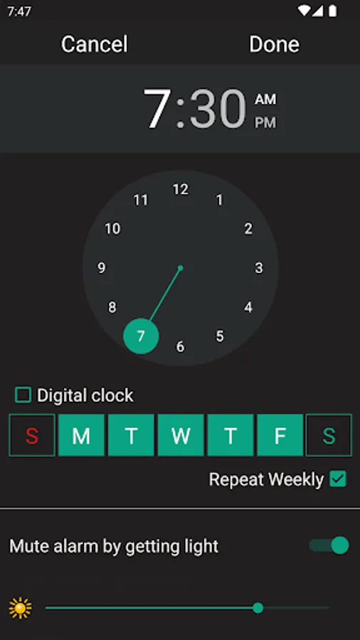 Alarm clock for android, great design and ease of use. You can turn off or postpone the alarm clock by turning on the room light, shaking the phone and other options. Select an mp3 or music file as alarm tone, use the camera flash light to wake you up before the alarm starts ringing and many other features.