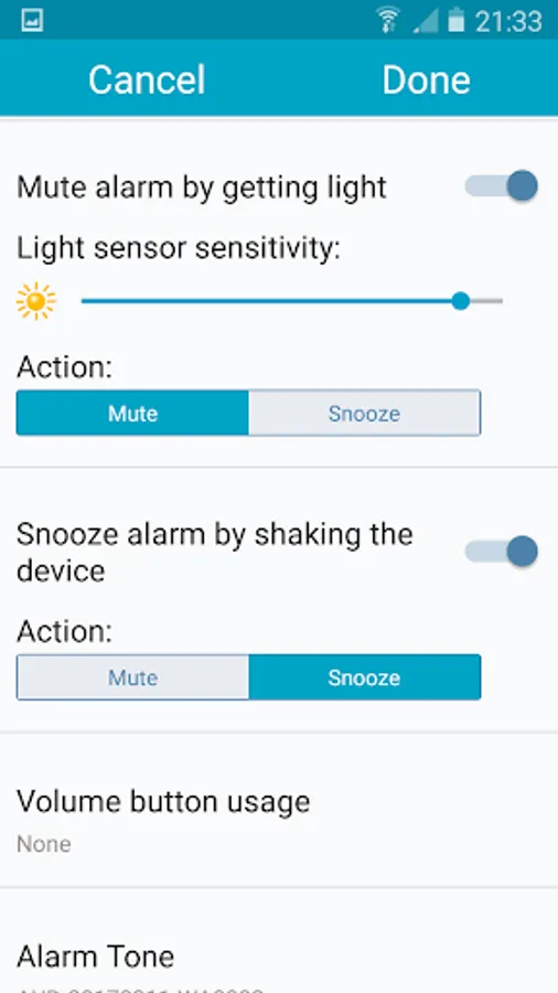 ✓ Alarm can use the camera flash light turning on or blinking helping you wake up. You can also set the time between the flash light starts and the alarm starts ringing, this way you can wake up gently or if you do not sleep alone avoid waking the other person.