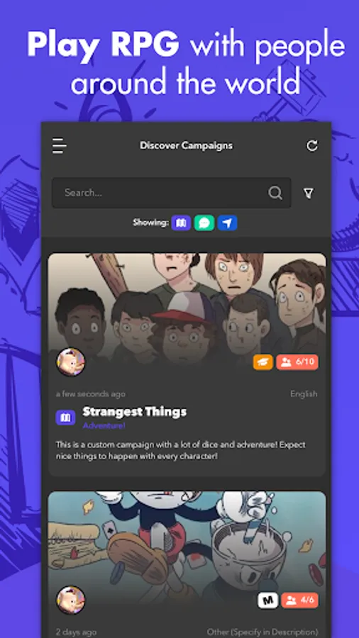 CAMPAIGNS: Create RPG campaigns and invite your friends to play. You can play in multiple campaigns at the same time, with different game groups.
