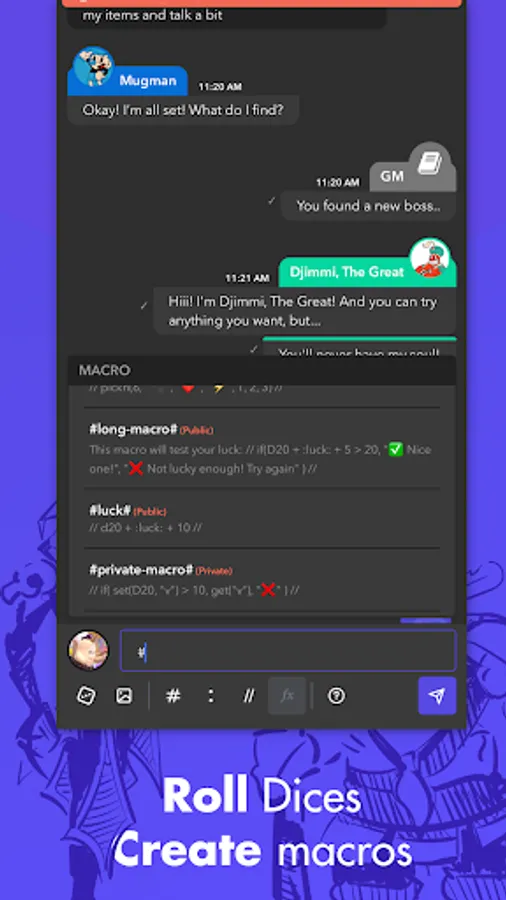 DICE: Roll dice and see the results without leaving the chat screen. Everyone will know what you rolled. Use the standard dice notation to express your rolls: