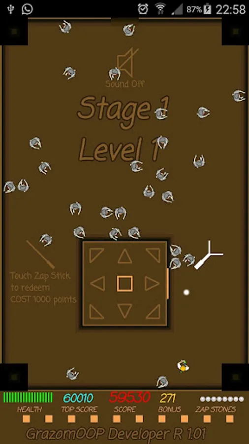 3 - Score starts at 60000 (red color to indicate cheat mode), and player is more resilient against zombies to allow you go quickly through all levels in order to understand how the game works.