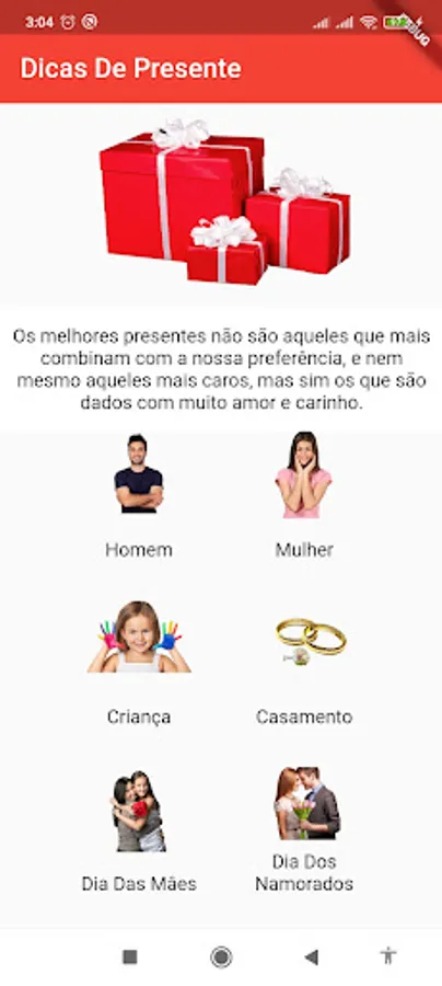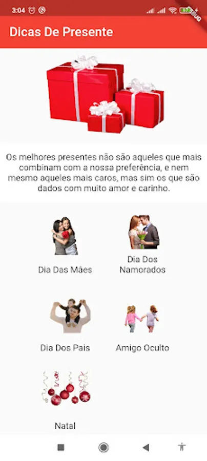 In the application you will find gift tips for the best holidays, mother's day, friend's day, valentine's day, father's day, children's day, hidden friend and christmas.