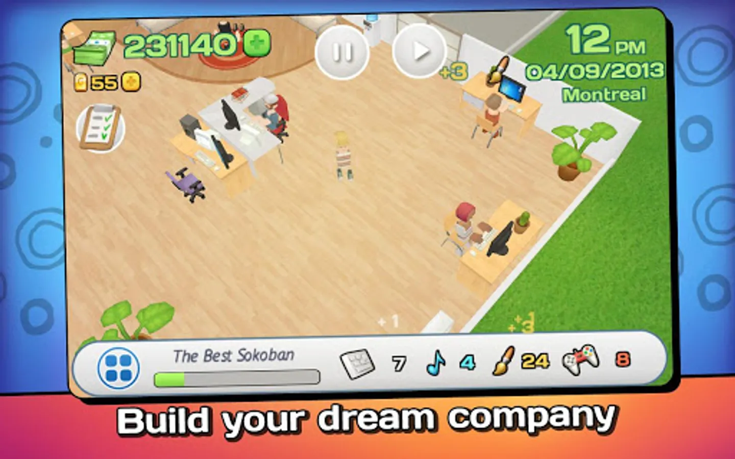 Try to turn a small garage start-up into a large company. Make strategic decisions, buy tables and table plants, hire and train people. Fulfill their wishes! Create mobile applications!