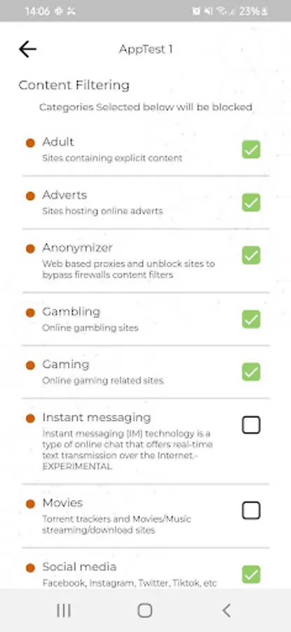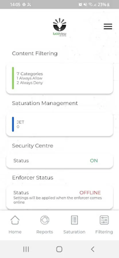 Access and Configure the Content Filter, Intrusion Prevention, Saturation Management (content based traffic shaping) and Reporting modules for any existing Enforcer Profile Linked to your App Account.