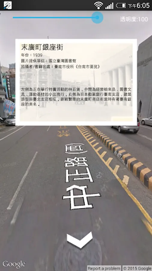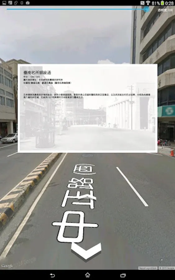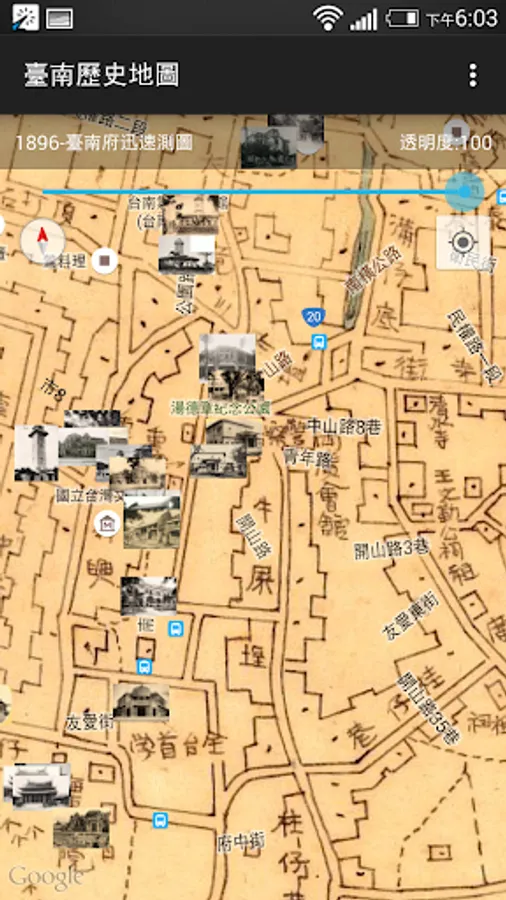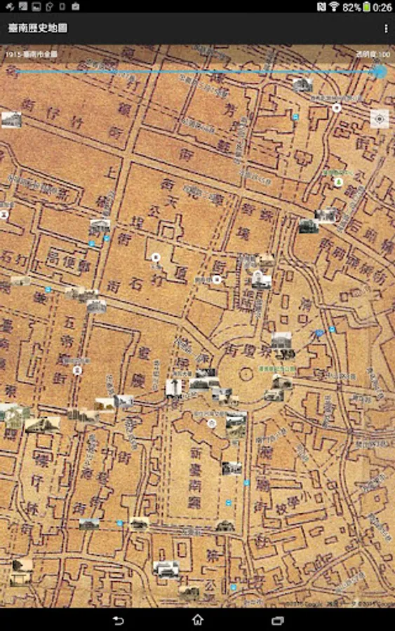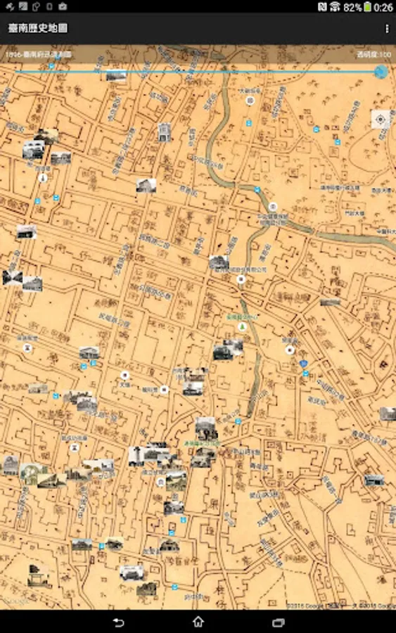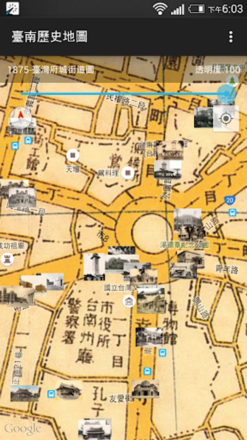 The Tainan Historical Maps gathers old maps and photos published between 1875 and 1978 and compares them to Google Maps and Street View. When a device's mobile positioning function is added in, users can compare the old and new maps and photos as they walk around, allowing them to "travel in time" and relive the elegance of old Tainan. Eleven different maps of Tainan's streets from different eras provided by the Academia Sinica Center for Geographic Information Systems (GIS) and the Research Center for Humanities and Social Sciences (RCHSS) show an area approximately within Tainan's city limits. It also contains 129 photos from the archives of the Academia Sinica Institute of Taiwan History, National Taiwan Library, and the National Taiwan University Library that include images of official buildings and street shops.