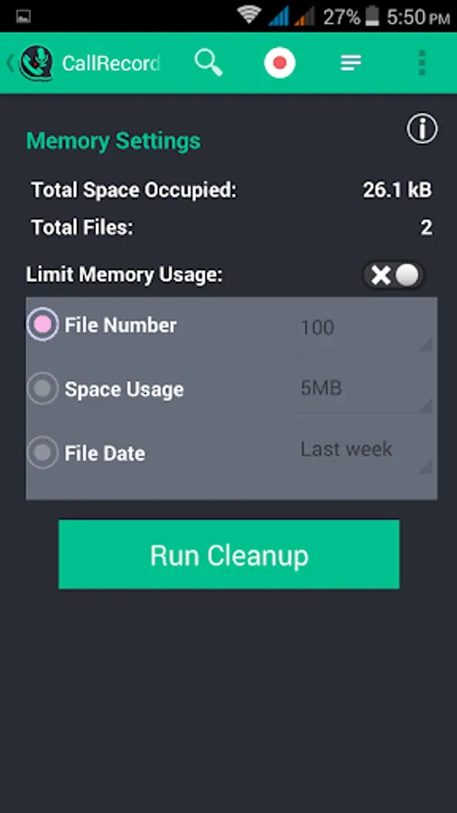 • Advanced Memory Management. It is possible to limit the memory space occupied by the recorded files. You can choose between file number limit, space usage in Megabytes or Date of the recording.
