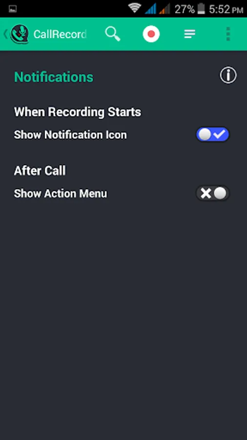 • Notifications. Once the recording has been started you can be notified either by notification icon or a sound. You can even choose which sound will be played.